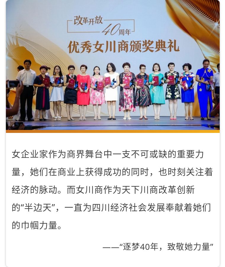 盛典同期發(fā)布了“改革開放40周年優(yōu)秀女川商”獲獎名單并舉行了頒獎典禮,集團(tuán)副總裁范力女士及其他24位女川商榮獲“改革開放40周年優(yōu)秀女川商”獎項(xiàng)。