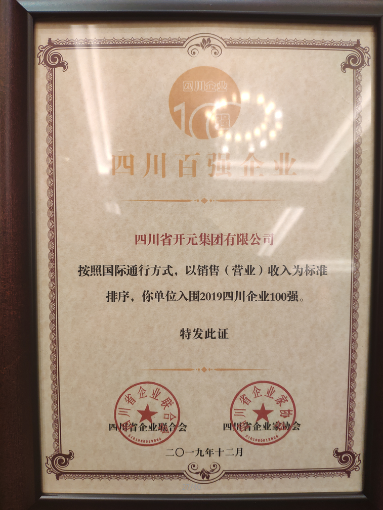 2019年12月17日,2019四川企業(yè)100強(qiáng)發(fā)布會(huì)在成都召開,會(huì)上2019四川企業(yè)100強(qiáng)新鮮出爐,四川開元集團(tuán)連續(xù)8年入圍四川企業(yè)100強(qiáng)。