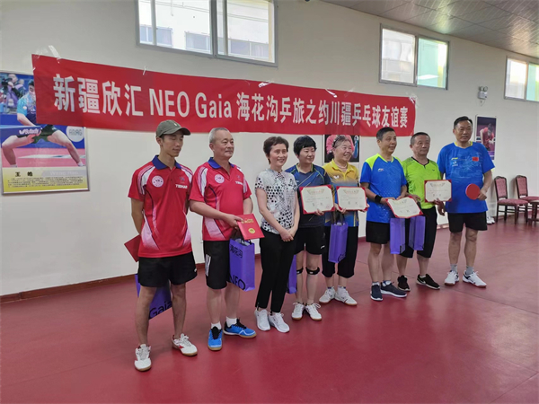 頂圖:首期新疆欣匯海花溝乒旅之約考察團成員在?;蠝峡跍虾嫌傲裟?。