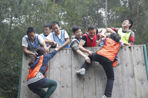 全體成員要在規(guī)定的時間內(nèi)翻越一面4.2米的光滑的墻面,在此過程中,大家不能借助任何外界的工具,包括衣服、皮帶、繩子等。所能用的資源只有每個人的身體。當(dāng)培訓(xùn)師講完這個科目的要點時,我看著這堵4.2米的高墻,心里困惑這怎么可能上去呢?豈料,隊伍中已經(jīng)快速計劃、組織、協(xié)調(diào)力量,密切合作起來,神速般的達(dá)成了默契,兩位隊友很快翻越高墻,并招手迎接新的攀登者。將這看似不可能完成的任務(wù)變成了現(xiàn)實,這些高高在上的“純爺們”,戰(zhàn)勝困難的決心和信心,讓我們心生贊美。大家的團(tuán)結(jié)一致,并沒有落下任何隊員。
